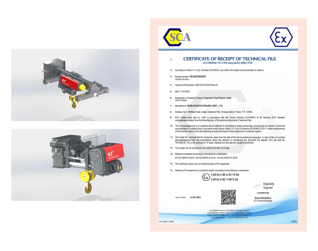 ATEX認(rèn)證不僅是歐盟市場的準(zhǔn)入標(biāo)準(zhǔn),更被中東、東南亞等地區(qū)廣泛采信。這一認(rèn)證的獲得,將助力奧力通起重機(jī)快速進(jìn)入歐洲化工、石油、制藥等高附加值行業(yè),為全球客戶提供更安全、更可靠的起重解決方案。