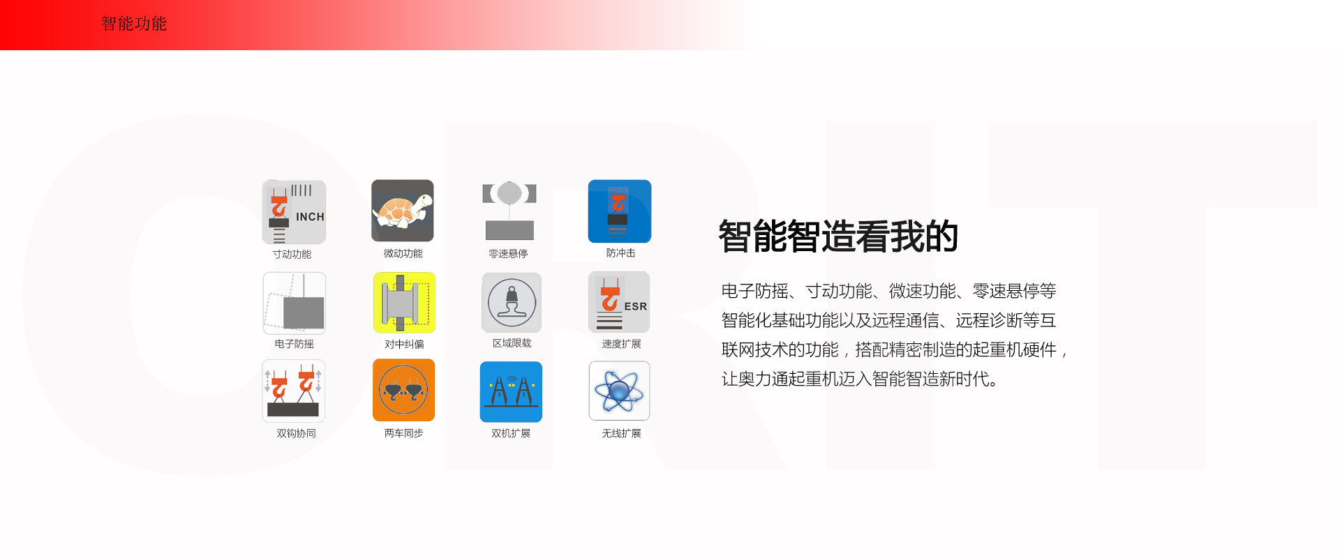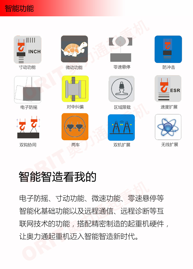 奧力通集起重機研發(fā)、制造、銷售、安裝、服務于一體,公司主要生產(chǎn)起重機、橋式起重機、門式起重機、雙梁起重機、單梁起重機、歐式雙梁橋式起重機、歐式單梁橋式起重機、歐式懸掛起重機、多支點懸掛起重機、歐式雙梁門式起重機、歐式單梁門式起重機、歐式半門吊、歐式壁行吊、歐式懸臂吊、歐式輕型起重機等通用標準起重機,以及全自動智能化起重機、冶金類起重機、防爆類起重機、航空專用起重機、核電站專用起重機、造紙專用起重機、電廠起重機等特殊專用起重機。